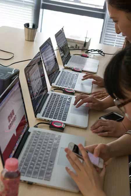 可立享無線會議演示器除了主機,還配有四個按鈕,按鈕可以說是整個系統中最讓人驚奇的地方,也是最容易讓人感受到“可立享”的地方。按鈕如藍牙鼠標般大小,通過USB接口與電腦連接,同時通過系統自帶的無線網絡與可立享主機連接。