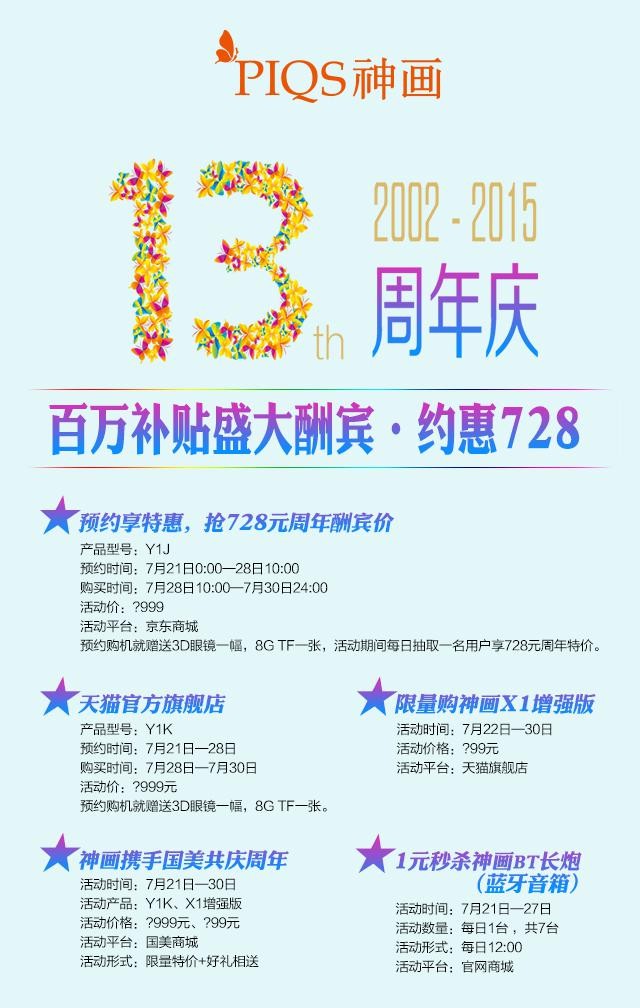 神畫將在京東商城、天貓官方旗艦店、所有經銷商店鋪、國美、官網等平臺正式啟動周年慶典,屆時新品Y1J/Y1K都會以最大優惠價*999元的價格發布,另外,神畫第一代具備自動對焦的產品X1增強版,將以*99元進行清倉大優惠活動,而且購機即刻贈送3D眼鏡一幅+8G TF一張。同時,活動期間每日抽取一名用戶享728元周年特價,如果你和神畫有緣,或許那個幸運者就是你。值得注意的是:預約時間為7月21日0點—28日10:00,搶購時間為7月28日10點至7月30日24:00,此刻值得擁有無需剁手。7月21日—27日,官網商城更有1元秒殺神畫BT長炮(藍牙音箱)活動,名額有限,您準備好了嗎?