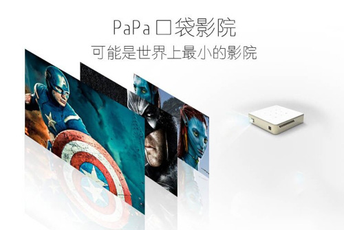 PaPa口袋影院是一款便攜式智能投影儀,體積只有手掌大小,450流明,能投射出100吋畫面,售價(jià)1499元,續(xù)航兩個(gè)多小時(shí)。操作系統(tǒng)基于Android 4.4定制,交互上則是使用傳統(tǒng)的遙控器,同時(shí)機(jī)身上配有觸摸按鍵。