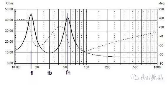 在上圖中,倒相箱的阻抗曲線形成了兩個明顯的峰,兩峰中夾著一個谷,這就是倒相箱阻抗曲線的典型形狀。其中,頻率較低的峰的頻率可記作fl,頻率較高的峰對應的頻率可記為fh,而谷的位置記為fb。fb就是倒相管與箱體共同組成的一個亥姆霍茲共鳴腔的諧振頻率,簡單地說,就是倒相箱的諧振頻率,fb的b就是box的簡寫。(附加一個問題,這個頻率與單元的參數有沒有關系?)