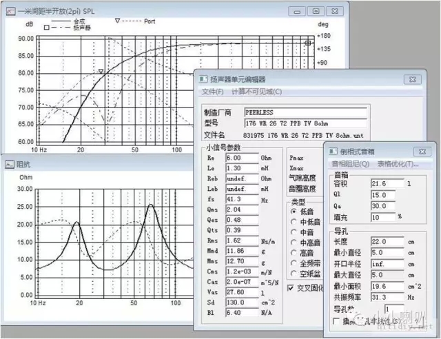 A、判斷箱體的調諧情況是否符合設計預期。比如將初步完成的箱系統的阻抗曲線與模擬的進行比較,如果差異較大,可以據此尋找原因。具體過程可以參考D‘Appolito的《實用揚聲器測量》。這里要注意的是,阻抗測量結果受測量電平影響很大,T/S參數測量時的信號電平以及最后實測時的電平都會造成這個差異,應該區別對待。