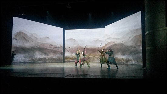 其中,雁丘詞亮點之一就是首次在舞劇舞臺上大規模使用投影技術,摒棄繁雜的實景搭建,絕大多數舞臺布景效果變換通過三塊巨幕投影實現。中部屏幕高8米長12米,兩側兩塊各高6米長8米,創同類舞劇舞臺投影之最。從繁華都市到潑墨山水,從氣象萬千到四季輪回,從風到雪,從天地到人間,均在這三方巨幕上呈現。如此化繁為簡的神奇妙筆,為《雁丘詞》開啟了一扇門,觀眾可以穿越千年,共賞詩情畫意,感悟永恒之愛。