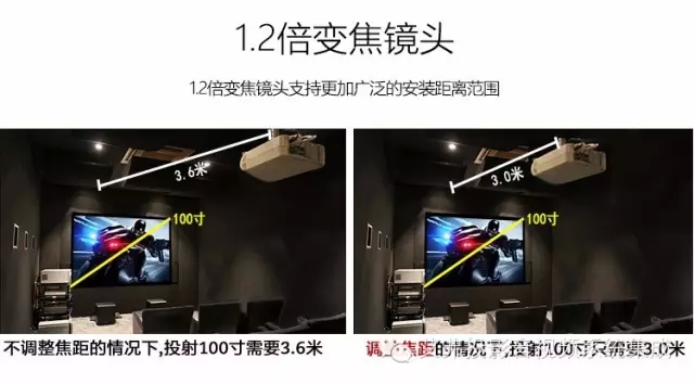 鏡頭手動1.2倍變焦(投射比:1.47-1.77:1),手動對焦,F(xiàn) =2.1-2.25,f=19.11-22.94 mm