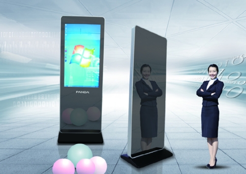 熊貓商顯全新推出的55寸感應(yīng)式鏡面廣告機(當客人接近鏡面廣告機時,通過紅外感應(yīng)到人體。原來鏡子的其中一塊區(qū)域,立刻播放廣告。當客人離開時,自動恢復(fù)為鏡面.)閃動式的鏡面廣告機(不帶紅外感應(yīng)頭,顯示的廣告畫面循環(huán)切換。其中熊貓電子集團的鏡面廣告機,切換速度可調(diào)。切換方式可調(diào)(漸變切換,或跳動切換))