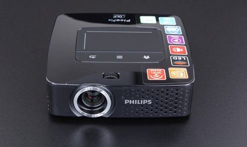 飛利浦PPX3615微型投影機采用了LED光源,產品內置了電池,在充滿電后,能夠滿足2個小時的連續播放使用,因此在沒有電源插座的情況下也能方便用戶使用。在安裝調試時,如果機身本身已經充電,無需安裝電源接口,直接打開電源開關(推動設備側面開關約3秒鐘以開啟設備),即可使用,在投影使用時,用戶需要根據投影與幕布的距離來決定投放的尺寸,投影離幕布越遠,投放的尺寸越大。當然在變動這個投影距離后,投影效果也會發現變化,因此需要投影機上的焦距調節旋鈕來進行清晰度調整。