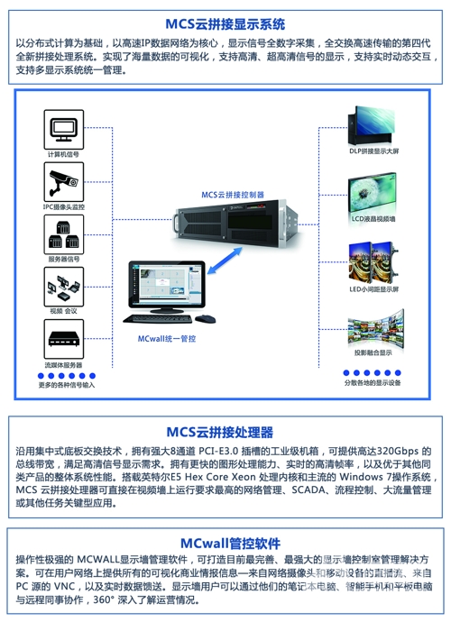 在信息數(shù)據(jù)爆炸性發(fā)展的互聯(lián)網(wǎng)+時代,IP產(chǎn)品的快速普及為顯示系統(tǒng)的大數(shù)據(jù)應(yīng)用積累了大量的原始數(shù)據(jù)和技術(shù)基礎(chǔ)。超大型數(shù)據(jù)中心與云拼接信號處理系統(tǒng)的完美對接,承載著環(huán)保云、交通云、衛(wèi)生云、旅游云、媒體云等多項(xiàng)科技應(yīng)用,與互聯(lián)網(wǎng)+緊密相連。云計(jì)算方興未艾的今天,DEPULL云拼接的絕對優(yōu)勢已初現(xiàn)光華,顯示“云”時代正在進(jìn)行,MCS“云”時代正在進(jìn)行。
