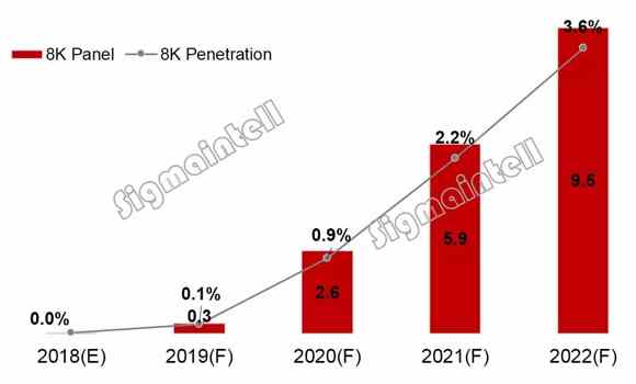 2018年三星(SDC) 8K面板正式量產,開啟了8K面板的元年,2019年韓、臺、中等主流面板廠均積極規(guī)劃8K產品,8K面板將在2019年正式起步,帶動液晶面板的分辨率實現(xiàn)再一次的跨越。而在今年的IFA等國際大型展覽上,主流電視品牌廠商也紛紛展出8K電視產品,足以看出品牌對于8K產品的布局和決心。但2019年受到Soc解決方案尚不成熟,產品良率偏低以及成本過高等因素影響,預計實際量產出貨的數(shù)量非常有限。根據(jù)群智咨詢的數(shù)據(jù)顯示,預計2019年全球8K面板的出貨數(shù)量約為300Kpcs,滲透率為0.1%,8K市場處于起步階段。而2020年之后,隨著生產制造的條件成熟及成本的下降,以及品牌積極推廣和5G網絡等各方面條件的逐步成熟,將會帶動8K面板市場迎來飛躍發(fā)展。據(jù)群智咨詢預計,到2020年8K面板的面板的出貨數(shù)量將會達到260萬臺,滲透率提升到1%;而到2022年8K面板的滲透率將進一步提升到3.6%,搭載著5G網絡快車,8K將會迎來飛躍式的增長。