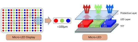 Micro LED技術將是以小于100μm的微小LED粒子,通過巨量轉移技術,將RGB三色源轉移到TFT基板上,形成Micro LED自發(fā)光顯示器。其在技術壽命、對比度、能耗、反應時間等方面均有非常優(yōu)越的表現(xiàn),是業(yè)界期待的下一代顯示技術。