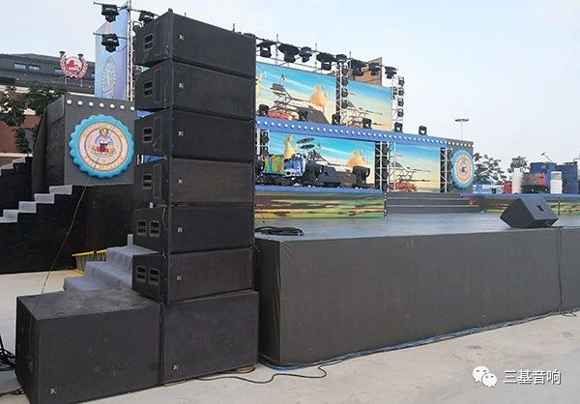 迎賓儀式巡游表演區、南區高端飲酒區舞臺、西區舞臺均采用T-LINE線陣系統,由雙15英寸防水低頻音箱是與T-Line312H全頻防水型線陣列音箱一起成組吊掛組成的線陣列,與TLB-218配合組建就可組成指向性寬廣、投射距離遠、聲壓大、聽感良好的擴聲系統。
