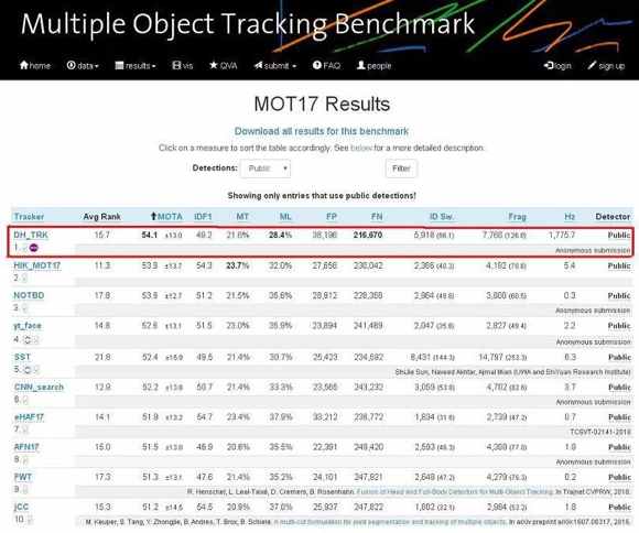 近日,大華股份基于深度學(xué)習(xí)技術(shù)研發(fā)的目標(biāo)跟蹤技術(shù),刷新了Multiple Object Tracking (MOT)競賽的全球最好成績,取得了行人多目標(biāo)跟蹤排行榜第一名,超越其它一流的AI公司和頂尖的學(xué)術(shù)研究機(jī)構(gòu),以及CVPR 2018年度最佳目標(biāo)跟蹤研究成果,這標(biāo)志著大華股份在目標(biāo)跟蹤領(lǐng)域處于世界領(lǐng)先水平。
