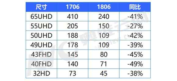 TV面板主要尺寸價格及同比降幅