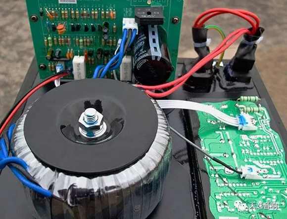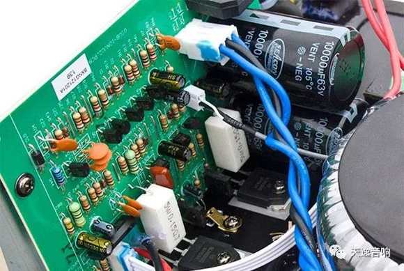 電路方面,以國產天逸的SUB-12TD低音炮為例:該低音炮輸入部分設計了一系列高通通和低截濾波器,其中分為:一級性能優異的低噪聲恒流源和電子穩壓的差分電壓放大電路、一級電流放大電路、末級高效率的大電流甲乙類推挽功放電路等。功放最末級增加了一級由Q12/Q15擔綱的電流放大擴充電路去推動達林頓功率放大,推挽電路上下臂共4只15A/150W的2SC5200/2SA1943東芝大功率管,配合超大的鋁合金外露式梳狀散熱器,以確保該電路在4歐時有350W的充足功率輸出。相信這樣大的功率儲備,足以滿足一只優秀低音炮的嚴格功率要求!在充分保證主體功放電路優秀的同時,該電路還設計了一系列過流、過壓、過熱等保護電路,以保證該低音炮正常工作時的可靠性。開箱可見:在選擇電阻電容時,所有的電阻均選用優質五色環金屬膜電阻。在可能影響音質的主要通道和電源濾波部份,分別選用了音質好、可靠性高的音頻專用電容和倍受青睞、容量高達20000微法的日本紅寶石音響專用電解或MARCOM優質音頻專用電解大水塘;右側一只400VA的巨型變壓器十分醒目,為整機提供了充沛的動力保障!