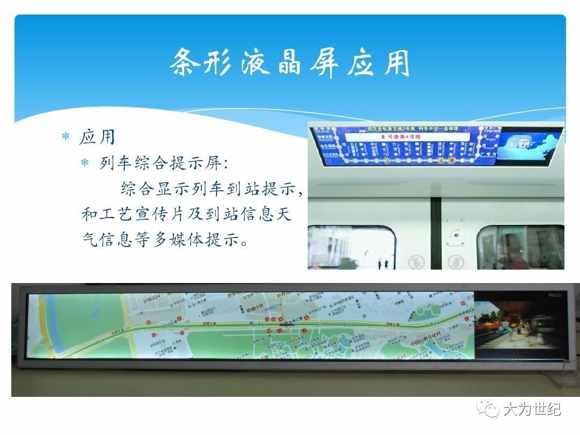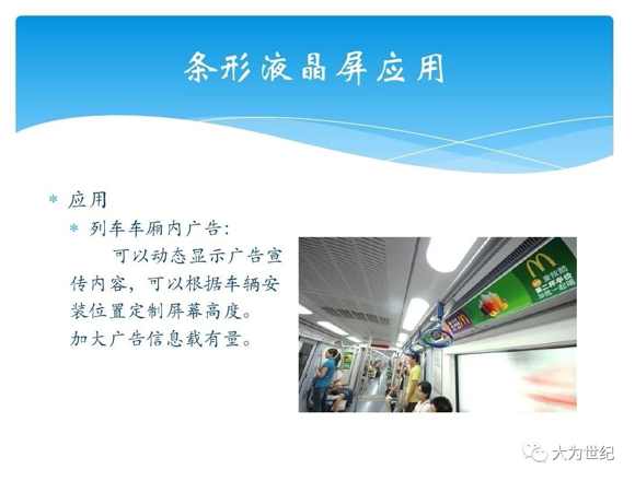 可以作為公交地鐵室內報站屏、的士車頂屏,在地鐵、公交汽車顯示,出租車頂部,地鐵車廂,綜合顯示車輛到站信息和其它多媒體信息。