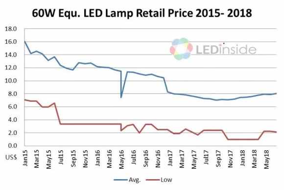 LEDinside自LED照明市場(chǎng)發(fā)展之初即開始追蹤市場(chǎng)價(jià)格信息,根據(jù)LEDinside的歷史數(shù)據(jù),以一顆相當(dāng)于60瓦的LED燈泡價(jià)格來看,此價(jià)格在2011年一月時(shí)約45-50美元一顆,到了2018年七月,價(jià)格卻已經(jīng)下滑至不到10美元。