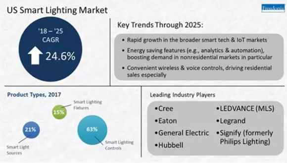 根據Freedonia Group的一份新報告,預計到2018年底,美國對智能照明的需求(包括光源,燈具和控制裝置)將增加到9.45億美元。市場研究公司表示預計到2025年,美國智能照明系統銷售額達到44億美元。