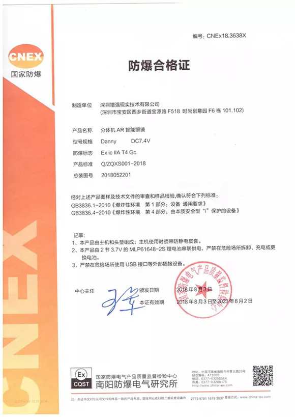 8月3日,國家防爆電氣產品質量監督檢驗中心南陽防爆電氣研究所向0glass AR智能眼鏡danny頒發防爆合格證,這是全國首款取得防爆認證的AR智能眼鏡!0glass無疑是AR智能眼鏡工業應用的領航者。