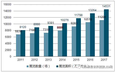 根據智研資訊網2011-2016年,研究的數據表明,我國舉辦各類會展展覽數量從6,830場上升到10,519場。展覽面積從8,120萬平方米上升到13,264萬平方米。展覽面積增長快于展覽項目增長,單位項目規模擴大,展覽行業呈現欣欣向榮趨勢。