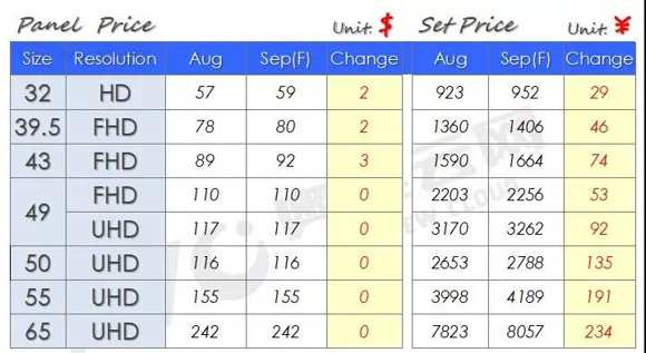 65":受品牌廠庫(kù)存壓力影響,65"需求增長(zhǎng)放緩,預(yù)計(jì)9月價(jià)格持平。