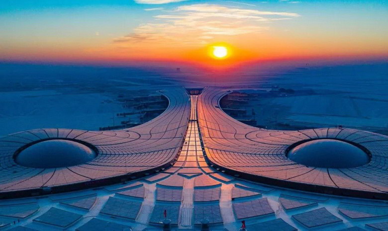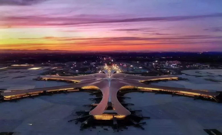 北京大興國際機場建成后將成為世界上最大的空港。航站樓形如展翅的鳳凰,是五指廊的造型。鋼網架結構形成了一個不規則的自由曲面空間,總投影面積達31.3萬平方米,大約相當于44個標準足球場。2025年新航城建成后規模相當于一個中等城市。除此之外,大興機場擁有世界上最大的減隔震航站樓,是全球首座雙層出發、雙層到達的航站樓,還使高鐵首次實現了下穿航站樓,創造了多項“世界第一”。