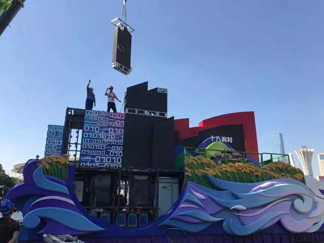 由明和獨立研制的彩車高清LED顯示屏,每個異形模塊都采用特殊定制開發而成,實現了高精度無縫拼接效果,與不規則的車體造型達到完美契合。三湘四水的風貌通過LED顯示屏動態載體,形成一幅幅流動的畫卷,是彩車之上最為靈動的視覺亮點所在。由于顯示屏結構復雜且最高高度達到10m,考慮彩車整體荷載要求,同時為了杜絕高度過高可能存在的安全隱患,選用強度高、重量輕、安全牢固的航空鋁型材作為主要承重結構件,兼顧重量與安全的雙重要求。