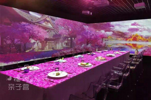 不止這些,還有冰雪世界、櫻花飛舞、游樂園主題等幾十種魔幻場景任意切換,每一個場面的色彩搭配都恰到好處。餐廳還會根據寶貝的心情、愿望以及菜色來搭配主題。