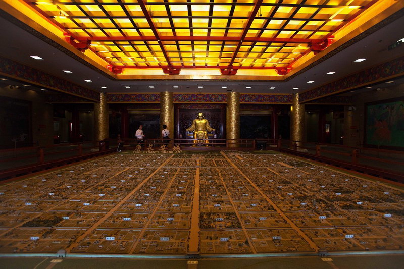 唐長(zhǎng)安城立體沙盤便位于該樓的一層大廳位置,長(zhǎng)8.55m,寬7.35m,還原了唐長(zhǎng)安城“百千家似圍棋局,十二街如種菜畦”的格局,是紫云樓重要的展出項(xiàng)目之一。沙盤的三面是三塊電動(dòng)升降幕,每塊電動(dòng)幕面積為8m*3m。三塊幕布在演出時(shí)降下,形成一個(gè)三折幕;在非演出時(shí)間幕布則會(huì)自動(dòng)升起,將坐落在沙盤后面的唐玄宗的金色雕像呈現(xiàn)出來。