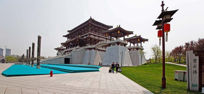 紫云樓位于大唐芙蓉園的中心位置,是全園最主要的仿唐建筑組群之一,并且它也是全園的點(diǎn)睛之樓。