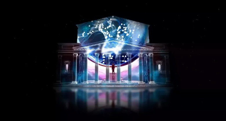 “天體力學”,兩座建筑的相互作用,設計師用3D Mapping在兩座建筑上講述一對愛侶的故事。
