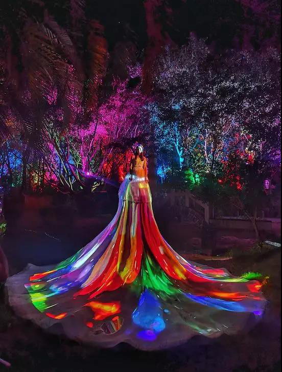 “花仙子”裙擺雕塑高3米,裙面尺寸約直徑6米,且凹凸不平,褶皺迭起。經(jīng)過(guò)精心的投影設(shè)計(jì),投影畫(huà)面完美覆蓋整個(gè)裙身。曼妙靈動(dòng),裙邊飛揚(yáng)的造型,配合華美俏麗的投影畫(huà)面,瞬間將雕塑變成一條“真正的”錦衣霓裳,滿足了游客對(duì)于“花仙子”的美好想象。