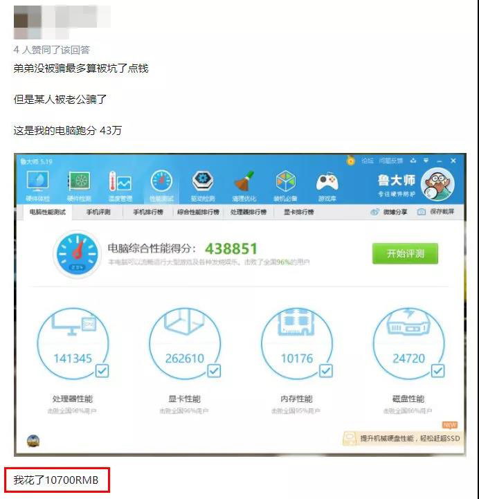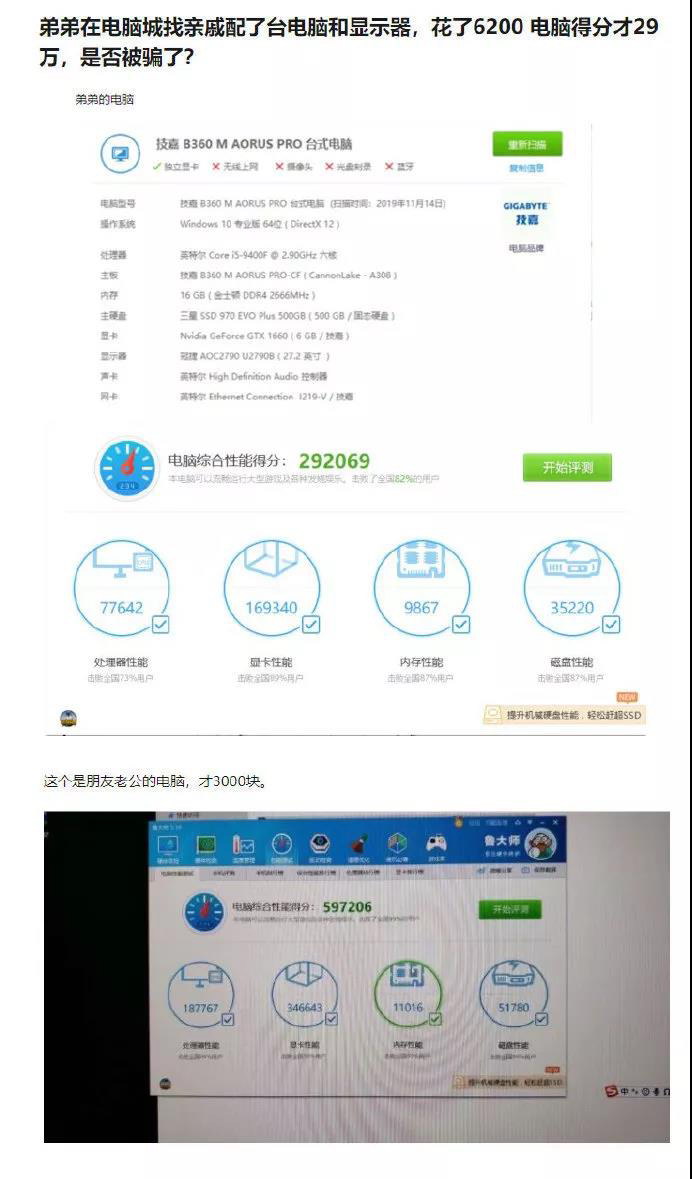 故事主人公的弟弟,花6000塊錢配了臺主機,跑分卻比不上老公的3000元主機。由于弟弟年紀尚輕,又是獨自一人去裝機,因此主人公懷疑是被電腦城的奸商騙了,所以上網求助。網友在看到弟弟的配置表之后,確認這臺主機的確值6000,但老公配的主機可不止3000了——廠商可不是開善堂的,要達到這樣的性能表現,價格肯定高于6000塊。