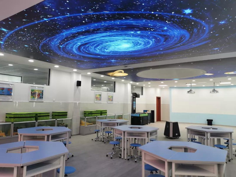 深邃的藍色、小組學習式的課桌椅以及四周的地理知識窗簾和地形地貌模型,羿飛地理專用教室一改傳統教室的設計布局,以更清新自由的形象展現在師生面前。