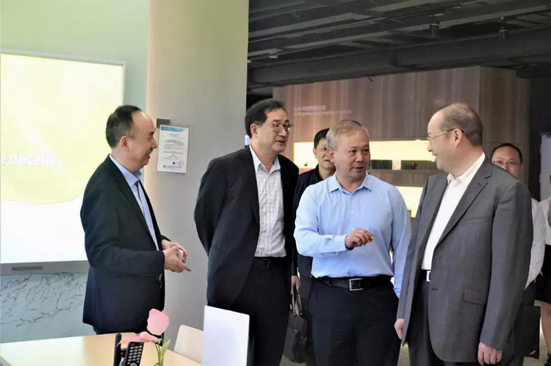 薄連明(右一)向嚴文斌副社長一行介紹激光拼墻