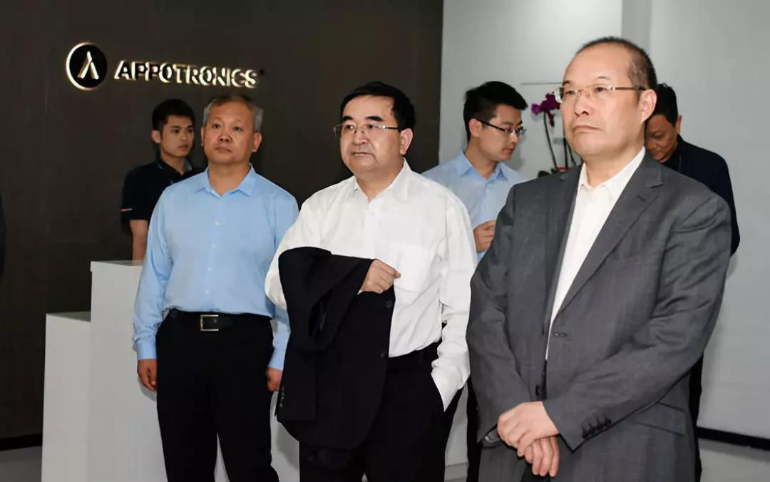 新華社副社長嚴文斌(前排右一)、新華社廣東分社社長徐金鵬(前排右二)、中國新聞發展深圳有限公司董事長張廣軍(前排右三)參觀光峰科技展廳