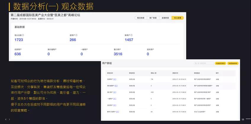 活動(dòng)結(jié)束后,詳實(shí)的多維度數(shù)據(jù)沉淀在微吼后臺(tái)。微吼對(duì)觀眾的行為進(jìn)行追蹤分析,通過觀看時(shí)長(zhǎng)、互動(dòng)頻次、分享轉(zhuǎn)發(fā)、邀請(qǐng)好友等維度給每一位觀眾進(jìn)行用戶分群,默認(rèn)可分為優(yōu)質(zhì)、高價(jià)值、潛力、一般、流失5個(gè)等級(jí)的群體。觀眾數(shù)據(jù)分析便于主辦方在后續(xù)對(duì)不同群組的用戶有更不同且清晰的運(yùn)營(yíng)策略。