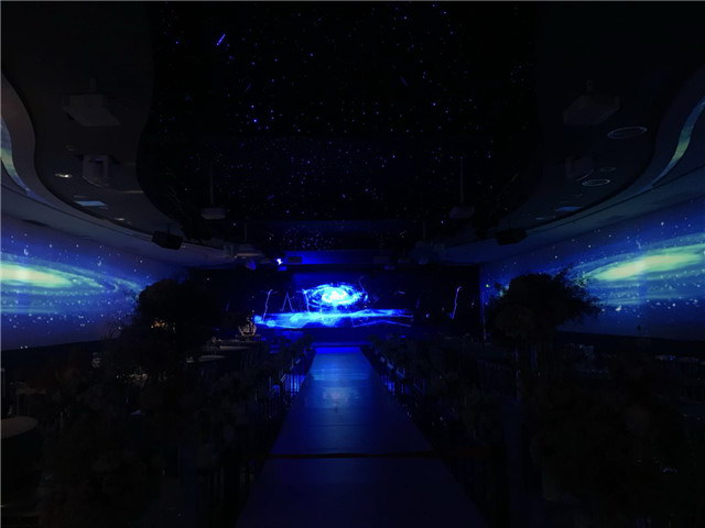 漫天繁星都是愛的見證,星辰環抱惟愿許你一世瀲滟柔光。伴著皇家藍由淺漸深,片刻后絢爛耀眼又如極光。顯然,液晶投影機更擅長于表現豐富的色彩和層次,但要實現270°大視角畫面且色彩無差異,需要克服色彩一致性的困難。CF6600U液晶投影機可以對色溫進行自定義,使多臺融合操作下的色彩趨于一致,再配合上劇院級燈光音響系統,能讓賓客感受到璀璨光影與現實并存的錯綜掩映。
