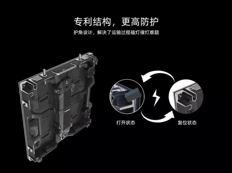 在實際應用上,箱體能真正無縫拼接,并且可以拼成直屏、曲屏、圓形等;領航系列還繼續延用了輕翼系列的防撞角設計,經過多輪測試,有效防止磕燈、死燈情況。