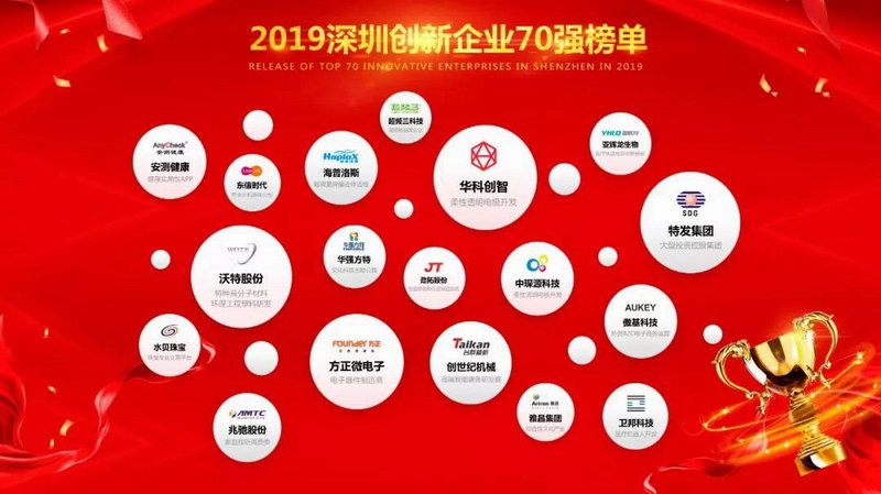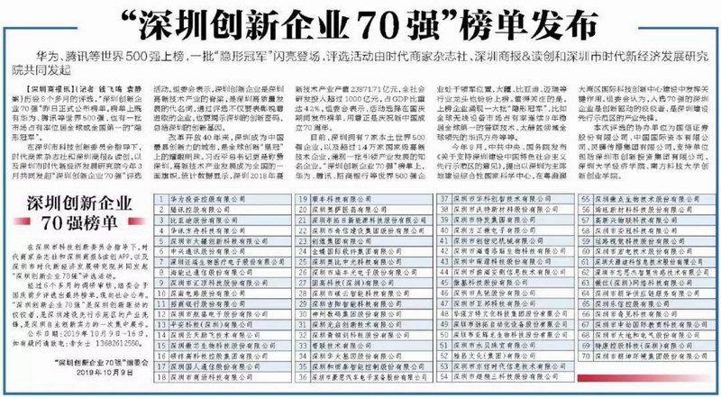 2019年是新中國成立70周年,在這舉國同慶的時刻,時代商家雜志社、深圳商報&讀創APP以及深圳市新經濟發展研究院共同主辦了“深圳創新企業70強”評選活動,并以此為祖國的70華誕獻禮。評選歷時近一年時間,組委會在深圳數萬家高新技術企業中評選出最終的“創新70強”。