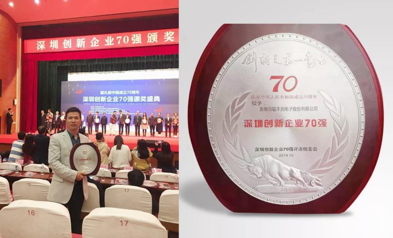 2019年12月13日,“深圳創新企業70強”頒獎盛典隆重召開,在經歷了重重篩選及公示后,深圳市瑞豐光電子股份有限公司成功入選并出席了此次盛典。入選70強的企業中,既包含了招商銀行、華為控股、順豐速運、中興通訊等這些耳熟能詳的企業,也包含了諸多在各行各業獨領風騷的隱形冠軍,由此可見本次活動評選的權威性。