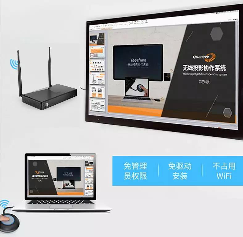 【冠藝GUANYEE】無線投屏高效協作系統:WHD-G801,是一款支持筆記本電腦、平板電腦等跨平臺多操作系統混合使用的高分辨率無線投影協作系統。用戶無需安裝軟件、設置、配置,也無需聯網,只需將USB發射器插入電腦,稍等片刻即可無線傳屏,高清1080P 立刻無線呈現。