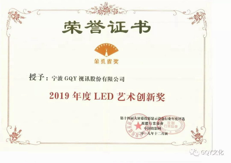 2019視聽行業高峰論壇暨金孔雀頒獎盛典于12月20日在深圳圣廷苑酒店隆重舉行。作為視聽行業最具權威性的行業論壇以及頒獎盛典,在現場六百余名與會者的共同見證下,GQY榮獲了視聽行業協會與中國投影網共同頒發的3項金孔雀大獎,分別是“2019年度小間距LED品牌大獎”、“2019年度大屏拼接品牌大獎”、“2019年度LED藝術創新獎”。