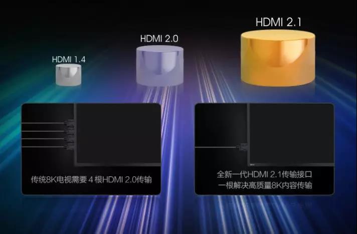 HDMI 2.0是目前比較主流的電視接口,它雖然能夠支持每秒60幀的4K視屏播放,但在傳輸8K內容時只能做到24幀/30幀每秒,差不多4根HDMI2.0傳輸接口同時工作,才能承受8K內容的數據量,實在是不太給力。