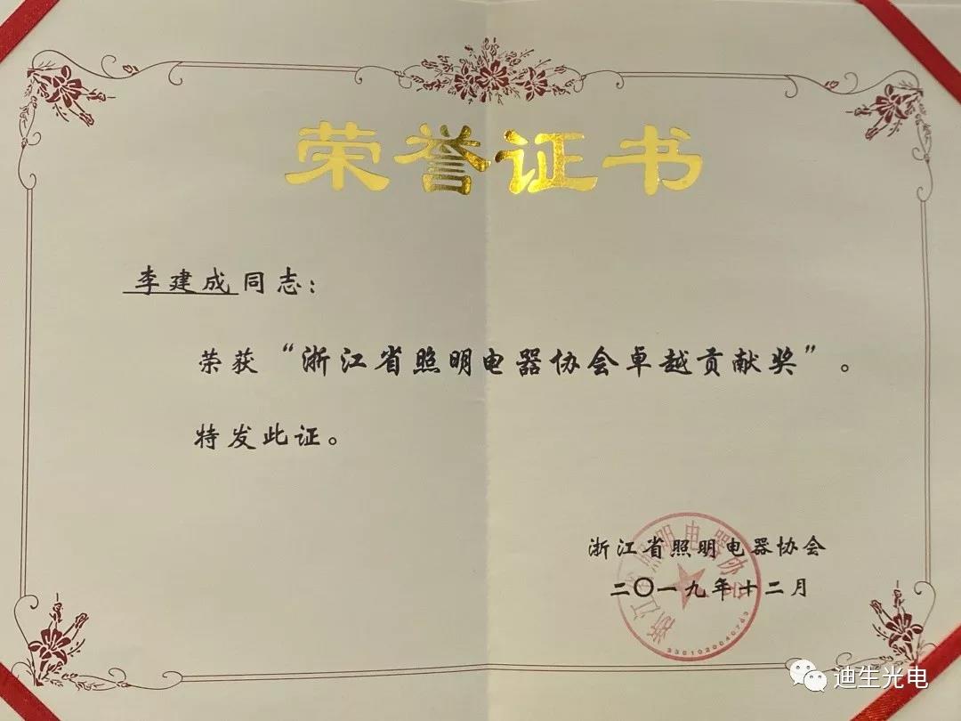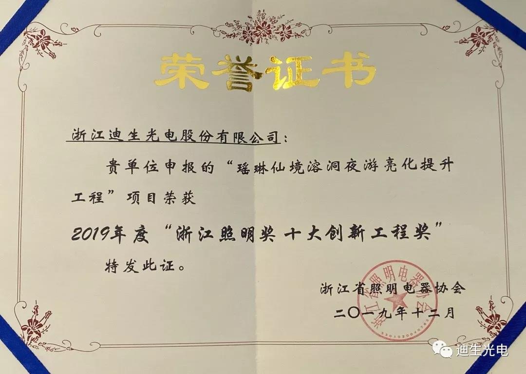 作為行業發展的積極建設者和有力推動者,浙江迪生光電一舉攬獲“浙江省照明電器協會優秀會員單位、最佳合作伙伴”、迪生光電董事長李建成榮獲“浙江省照明電器協會卓越貢獻獎”、企業申報的“瑤琳仙境溶洞夜游亮化提升工程”項目榮獲“2019年度浙江照明獎十大創新工程獎”,共計獲得協會授予的四個重要獎項。