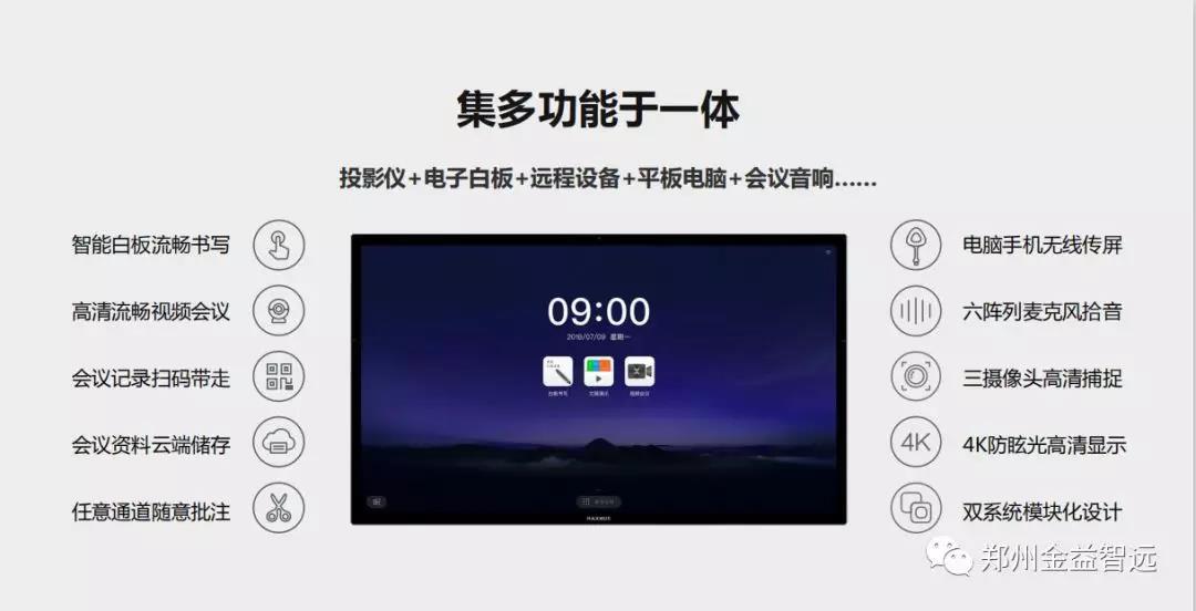 會議每時每刻都在發生,人們通過會議交流信息、達成共識、協同共創。會議是昂貴的商業行為,設備、人員、時間無一不是成本。在早期的會議室里,顯示昏暗的幕布,混亂不堪的線材,以及設備調試等待的時間,讓我們感到會議效率被大大降低了。我們設想,在企業會議室里,應該有一面清晰的會議屏,在上面書寫沒有空間限制,設備可以無線連接,會議不再需要人工記錄,無論我們在哪里,都能和業務伙伴身臨其境地溝通。