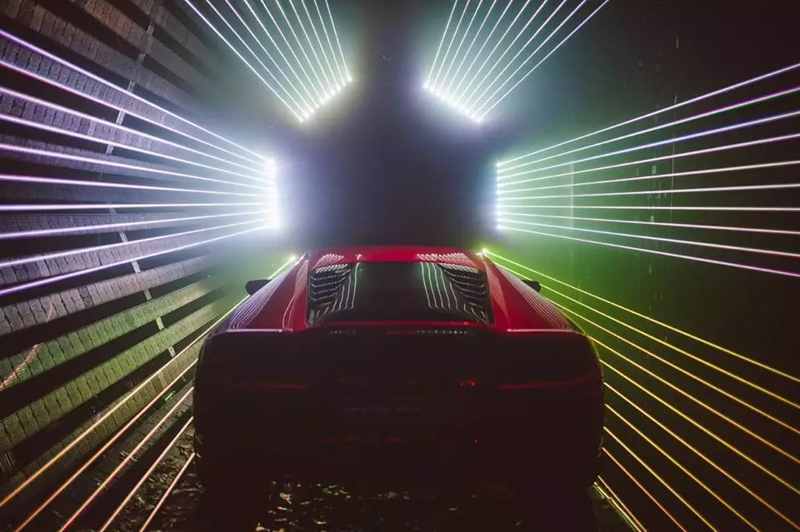 跑車(chē)在激光效果、煙霧、五彩紙屑大炮和半透明led屏幕襯托的效果下出現(xiàn)在觀眾視野中。