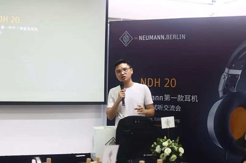 之后,沈鵬先生還為大家詳細介紹了Neumann NDH20耳機的產品特點。作為一款結合了卓越的隔離效果、精心平衡的聲場以及出色的解析度的封閉式耳機產品,NDH 20致力于幫助專業人士應付更多的工作場景。錦藝國際渠道經理吳杰春先生,則為大家補充了Neumann NDH20的產品亮點。NHD20采用全新設計的38mm動圈單元,強力釹磁鐵確保高靈敏度和低失真。NDH 20的Duofol振膜專業技術與HD800相同,追求精準的聲音控制,實現自然通透的真實聲音。