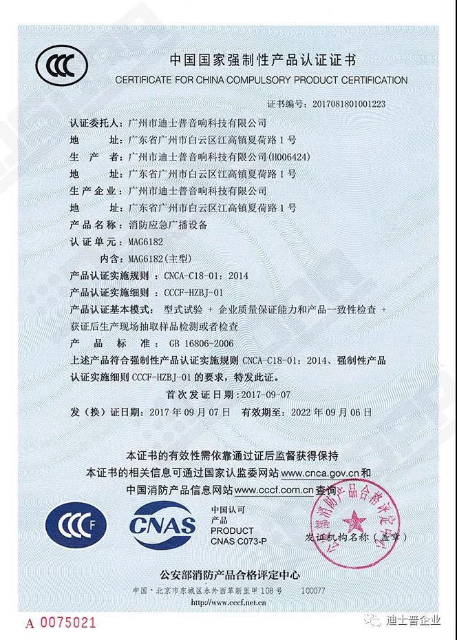 ▲由公安部消防產品合格評定中心頒發的中國國家強制性產品認證證書。