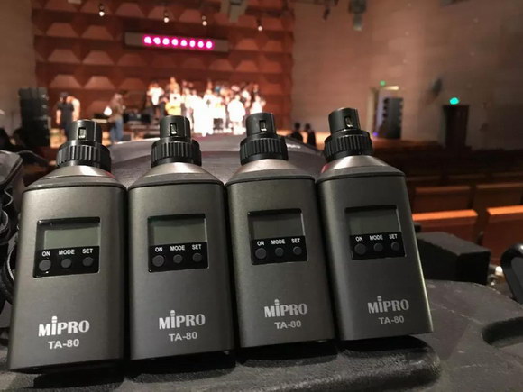 對于人聲演唱部分,使用了8通道的MIPRO ACT-848數字無線系統搭配頭戴話筒使用。另外,針對團體大合唱拾音部分,使用了4通道的TA-80插入式發射器將有線話筒轉為無線話筒使用。