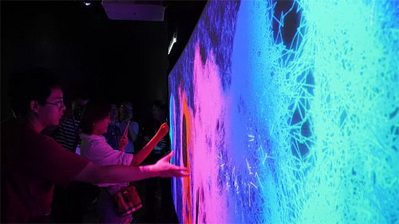 InfoComm現(xiàn)場(chǎng),索尼采用了最新上市的兩臺(tái)6500流明VPL-F640HZ激光工程投影機(jī)配以VPLL-Z3003超短焦鏡頭,結(jié)合MiTENE 4K AR娛樂互動(dòng)系統(tǒng),為觀眾打造了新奇的娛樂互動(dòng)體驗(yàn)。人們可用不同的手勢(shì)將畫面“打散”直至消失,或引導(dǎo)畫面隨身而動(dòng)。該展項(xiàng)采用了多臺(tái)傳感器,支持多人同時(shí)體驗(yàn),共享妙趣時(shí)刻,參與感十足。