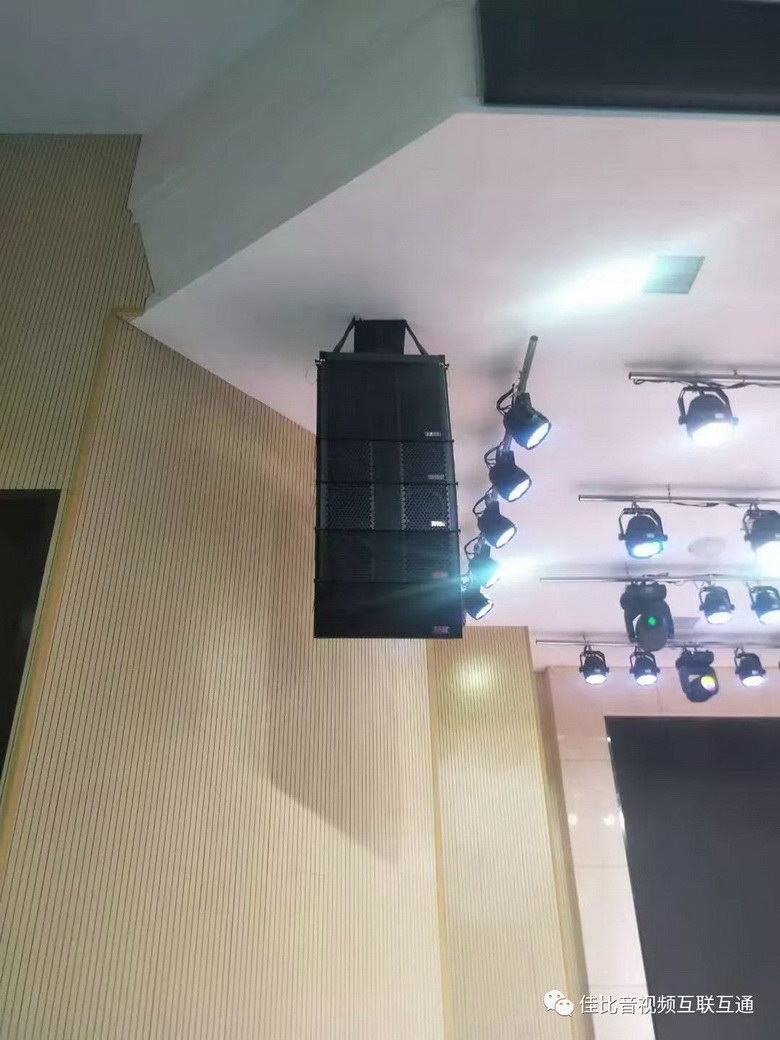 根據該項目廳實地場地大小、高度等情況以及該廳多用途使用功能需求,佳比在設備配置及布局上,遵循實用性、經濟性、科學性的原則進行設計。 作為學校演出活動居多,同時兼具語言擴聲的多功能廳,對舞臺音頻效果及整體擴聲服務效果有著較高需求。在廳內舞臺區左右上方采用的是線性陣列音箱作為主擴揚聲器,搭配舞臺返聽音箱、超低低音作為輔擴揚聲器,而觀眾席區域則采用是高品質系列全頻音箱,再匹配適宜功率功放及專業周邊處理器,保障該廳內各處都有足夠的聲壓,聲場覆蓋均勻。為避免聽音盲區,獲得更多的直達聲,音響擴聲服務角度進行了的精確調整,全廳聲音投射精準、聲像一致性好,高音音質優美,低音渾厚強勁,完全滿足廳內所需要的音效氛圍。