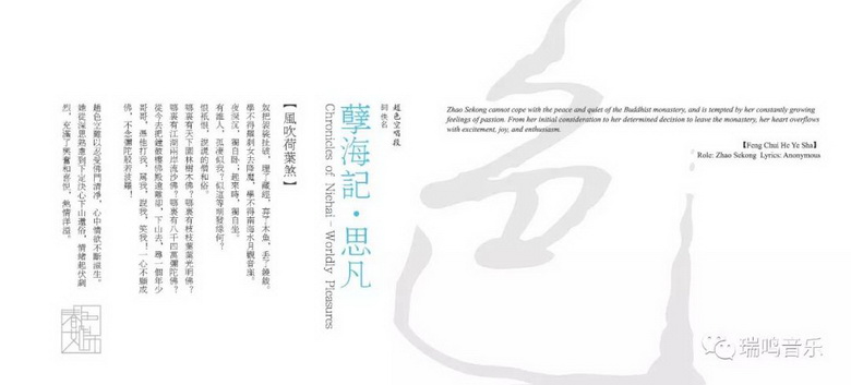 諦聽此雅韻專輯,別是一番意蘊氤氳在耳,嬌、嗔、癡的活靈活現喚起心底絲絲惻隱:春色滿園,煙波浩渺,月影婆娑……只覺意境迭起,情思流轉,萬般情愁凝聚于此,訴不盡可親、可恨、可憐、可痛、可嘆平生意氣,倒流落了纏綿悱惻,撲朔迷離,沉浸了你我閑情。